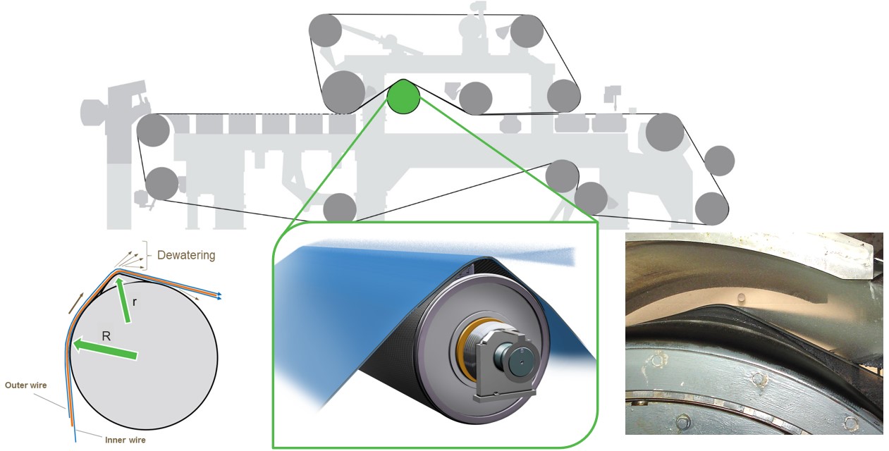 SLEEVE-ROLL cho thoát nước lưới đỉnh phần hình thành được mô tả như một lô đai lưng gù, theo đó lô chạy đai (belt) ép lưới dưới vào lưới đỉnh bằng với một cấu trúc lồi tại điểm ép mà tại đây thiết kế hình học của điểm lồi sẽ tạo ra chân không giúp văng thoát nước tối ưu khỏi lưới đỉnh.