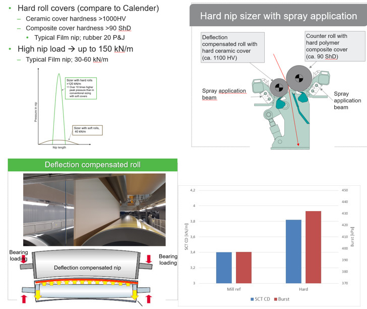 Hard-nipped Sizing – ép cứng khi gia keo bề mặt bằng sử dụng lớp bọc có vật liệu cứng và lực ép cao (150kN) khuếch tán keo đi sâu vào sơ sợi tạo liên kết chặt và bền đồng thời nâng cao độ bền bề mặt và giảm tiêu hao keo. Công nghệ sử dụng cặp lô bù biến dạng phủ cứng bằng gốm và lô đối trọng bọc composite cho phép chạy máy ở tốc độ cao trong khi đảm bảo độ dày, độ chặt và tăng tối ưu chỉ số chất lượng SCT và Burst cho sản phẩm.