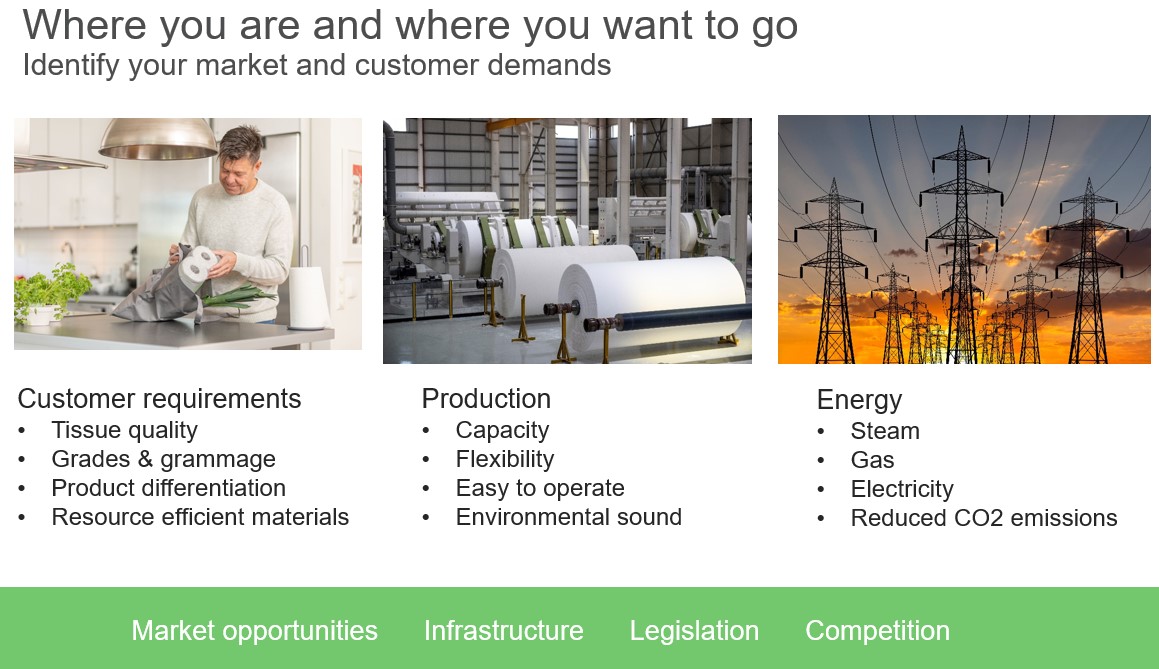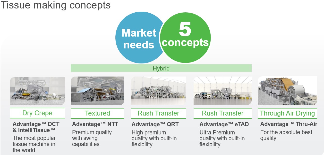 Valmet phát triển công nghệ bền vững cho sản xuất Tissue từ khâu chuẩn bị bột bao gồm cả DIP sợi tái chế tới xeo và ghép lớp/sang cuộn. Giữa công nghệ cho giấy trơn dóc khô (Dry Crepe) truyền thống tới sấy gió tạo hình cao cấp từ chăn ép (Thru Air Dry) là 3 giải pháp lai ghép (Hybrid) nhằm tối ưu hóa cơ cấu sản phẩm với chất lượng Tissue mong muốn là NTT, QRT và eTAD.