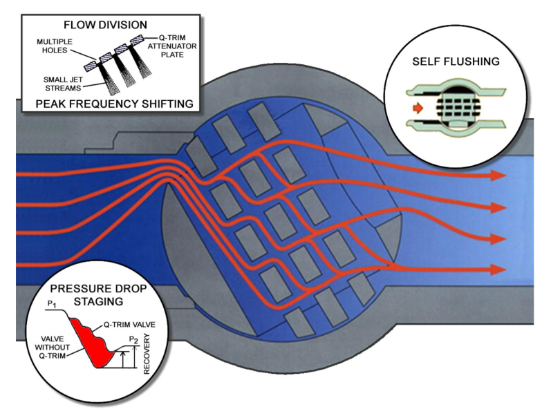 Most pulp and paper mills have maximum noise levels for control valves. These limits are easily exceeded, especially for gas and steam applications, when using standard valves. High pressure drops, which occur during control of water and liquid flows, generate cavitation which may cause damage to the pipe system. The solution to these applications is the Q-Trim design.