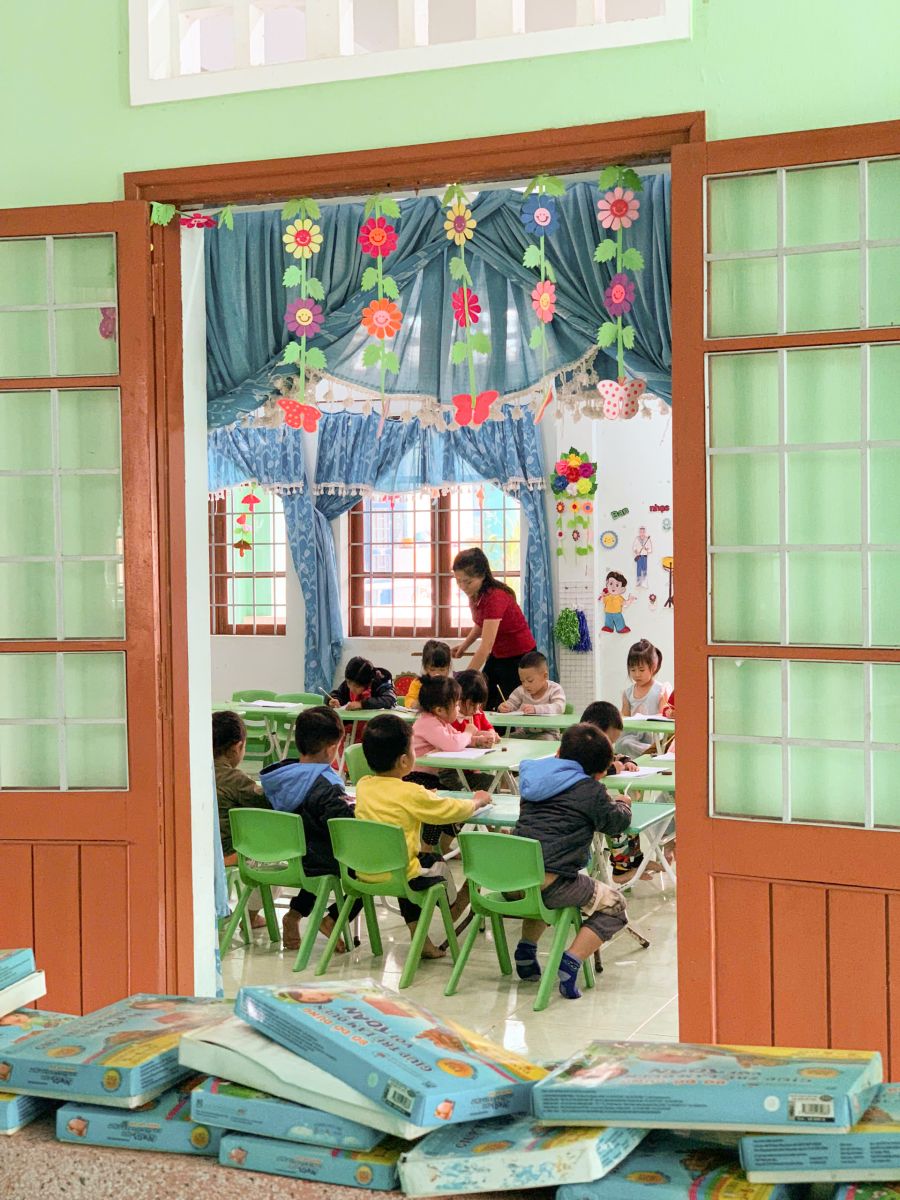 Ảnh: Máy tính mới được trao tặng cho Trường Tiểu học Hòa Đồng (bên trái) và hình ảnh lớp học tại Trường Mầm non Tân Hòa Đông (bên phải).